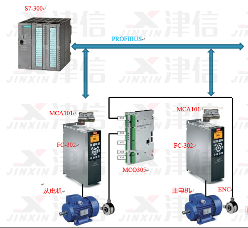 PLC與丹佛斯FC302變頻器之間進行PROFIBUS通訊,通過PLC可以設置同步功能、非同步功能、等工藝參數;FC302變頻器控制從機電機,以保證出標精度及響應精度。 變頻器通過MCO305運動控制卡,實現角度同步控制。MCO305運動控制卡內要編程,接收現場總線控制命令,發送各種狀態信號,實現各種控制,如單機運行/同步運行模式切換,判斷從機編碼器故障等。