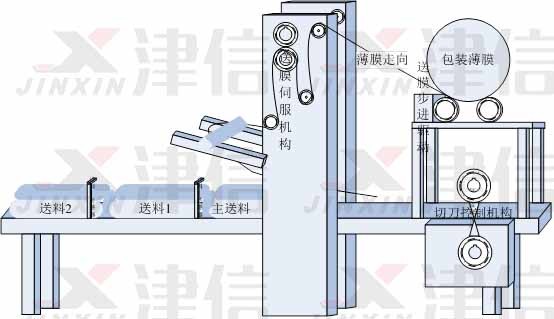 枕式包裝機(jī)主體基本上有送料部分、送膜部分和裁切部分構(gòu)成,如圖1所示。所有的動(dòng)作邏輯及相位控制均以主送料軸的主軸編碼器信號(hào)為參考進(jìn)行控制。本文將就臺(tái)達(dá)A2伺服內(nèi)置電子凸輪功能的應(yīng)用加以闡述。其內(nèi)置電子凸輪功能,具有低成本和高靈活性的優(yōu)勢(shì)。