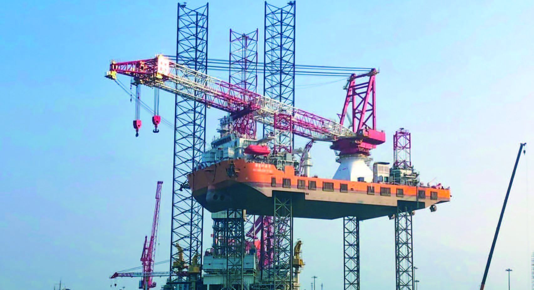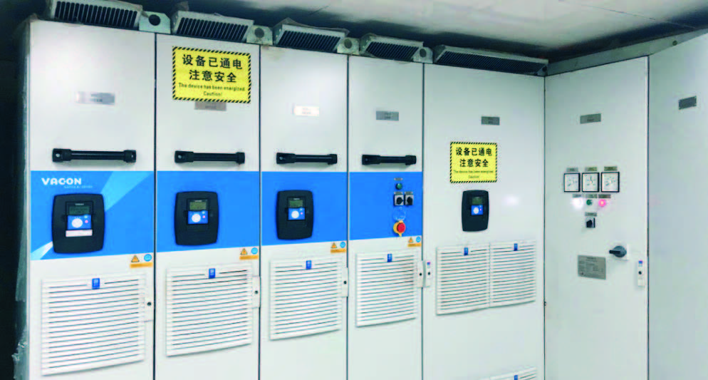 平臺(tái)的關(guān)鍵配置為變頻動(dòng)齒輪齒條升降系統(tǒng),整個(gè)平臺(tái)共有4個(gè)樁腿,可以自由上下升降,并且需要根據(jù)實(shí)際工況隨時(shí)調(diào)節(jié)三邊鋼結(jié)構(gòu)舷的應(yīng)力。整個(gè)平臺(tái)的重量都承受在4個(gè)樁腿上,因此對(duì)于啟動(dòng)時(shí)候的電機(jī)力矩有很高的要求。因此公司采用Danfoss VACON® NXPCommon DC Bus System系列共直流母線(xiàn)驅(qū)動(dòng)產(chǎn)品作為抬升系統(tǒng)的電氣驅(qū)動(dòng)使用。